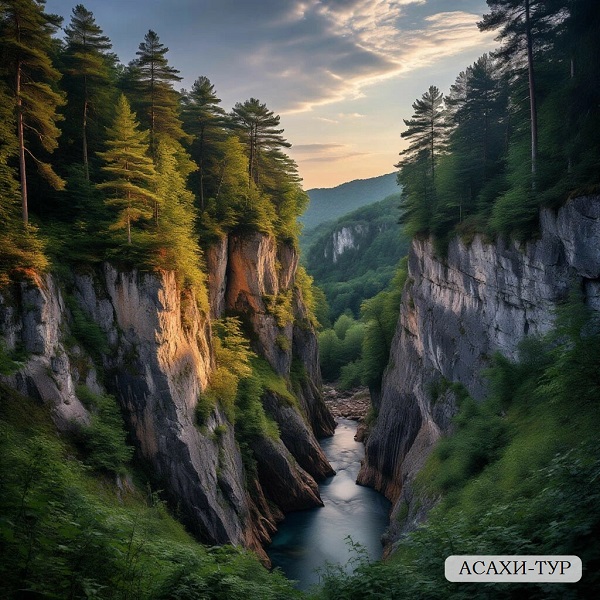 Ширина теснины в разных местах меняется от 7 до 20 метров, а высота скал где-то достигает 35 метров! Особенно эффектно это природное чудо смотрится под лучами солнца, которые подчеркивают контраст бирюзовых вод реки и белых, как мел, стен каньона. - Возвращение в Майкоп (→ 40 км).