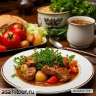 • Нежнейшее тельное из Волжской щуки с запечённым картофелем и сливочно-грибным соусом или телятина, томленная в печи с мясным соусом и тушеными овощами;